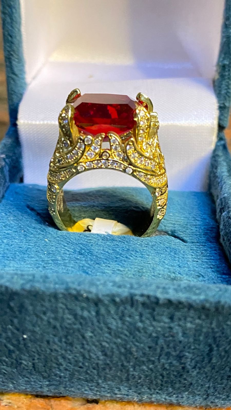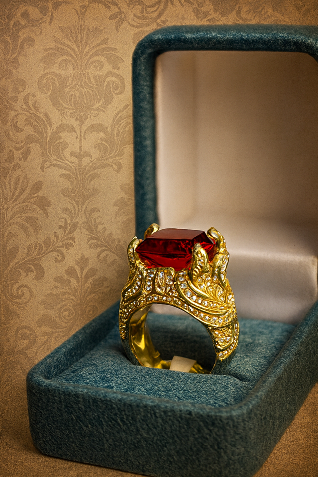 An ornate gold ring featuring a large rectangular red gemstone set in an elaborate claw-style setting, surrounded by shimmering clear stones. This piece exudes royal charm and timeless sophistication, perfect for collectors or those who love dramatic elegance.